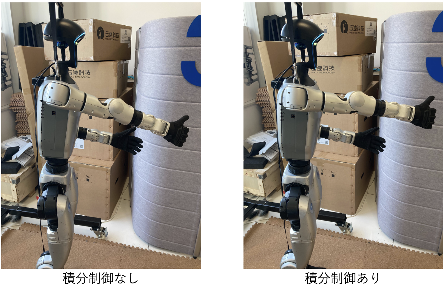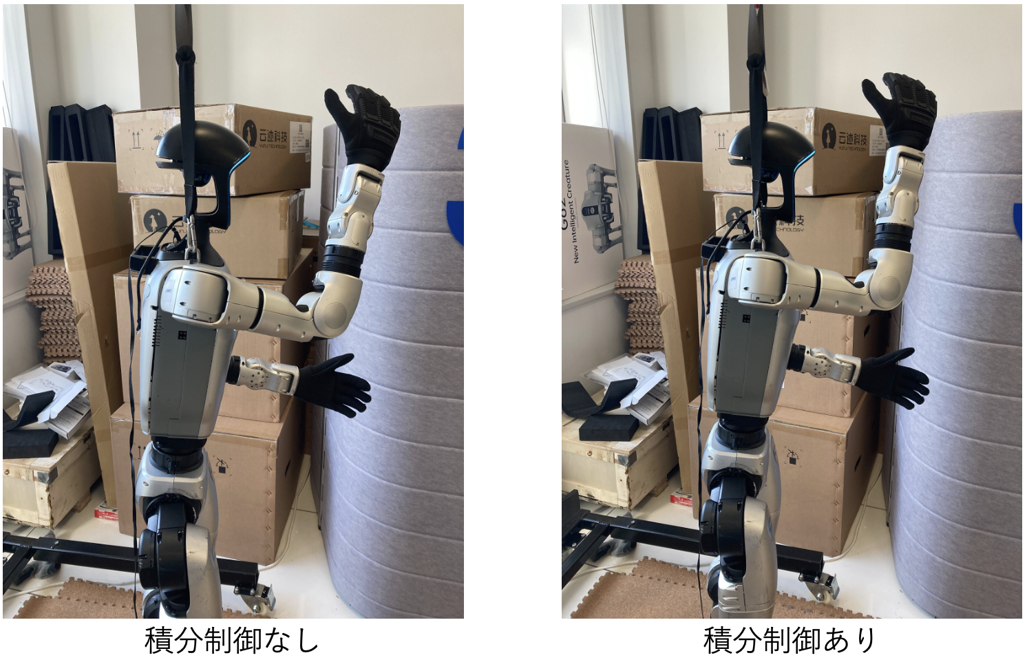 今回は,Unitree G1のモータの制御に積分項を追加して,目標角度との誤差を小さくする実験を行いました。積分項を追加することで,重力の影響を受けて目標角度に到達できない問題に対処できることを確認できました。一方で,小さく振動する問題は残っており,精密なタスクの遂行には正確な重力補償など別のアプローチが必要なことも確認できました。